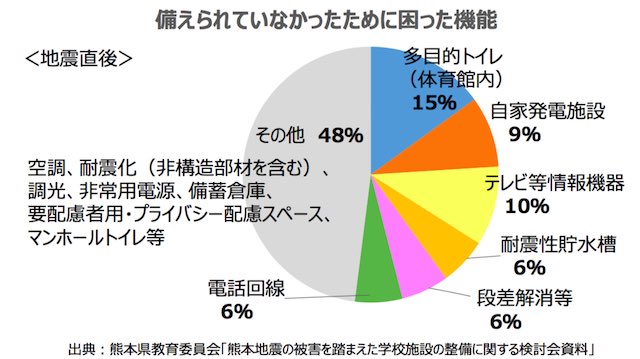 熊本地震を受け熊本県教育委員会が県内の学校設置者に対して行った調査では、備えられていなかったために困った機能として「多目的トイレ」がトップ。東日本大震災でも、文部科学省の報告書によれば、避難所として利用された学校525校のうち74.7%が、問題になった施設・設備として「トイレ」を挙げている。