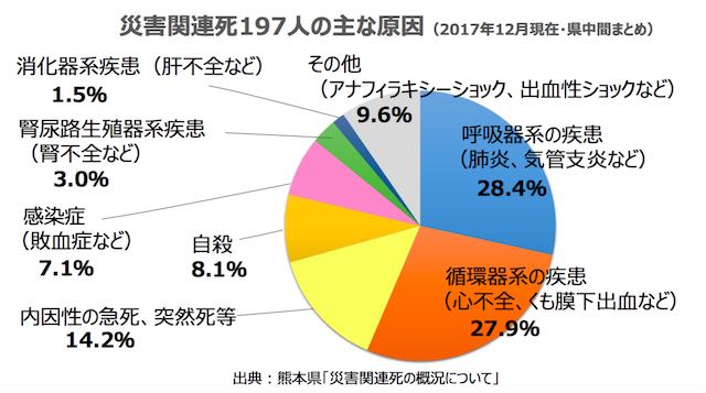 熊本県が発表した熊本地震の中間報告によると、2017年末までに県内で災害関連死と認定された197人の中で最も多かった死因は呼吸器系の疾患(肺炎、気管支炎など)で、その次が循環器系の疾患(心不全、くも膜下出血など)となっている。
