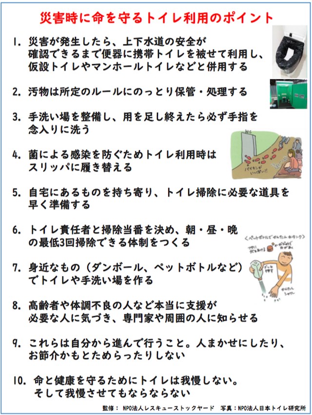 浦野さんは、「普段のトイレを使えるのが一番。水が流せなくても、携帯トイレや、なければ袋をかぶせれば良い」と話した上で、「衛生状態を保つ、必要なときは簡易トイレをつくる、といったことを避難者ができれば、専門家は彼らにしかできない支援に回れる。トイレの維持管理は、ポイントを知っていれば誰にでもできる」と訴える。